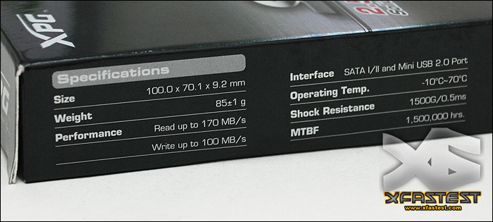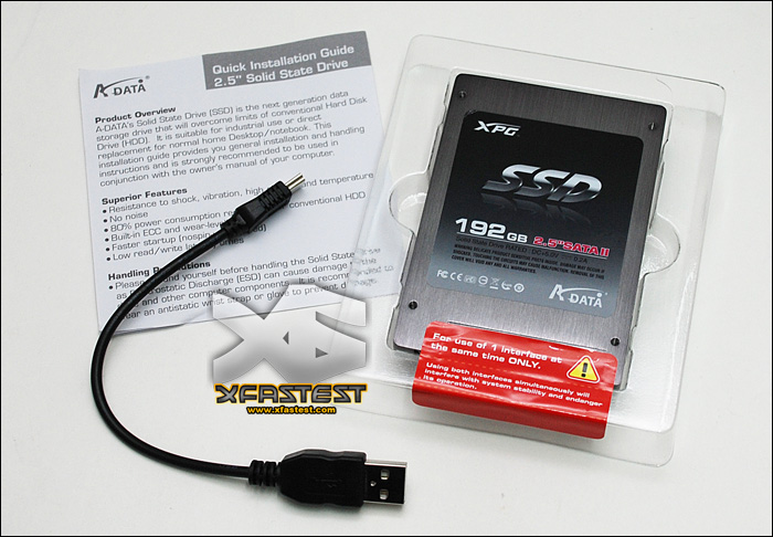 The packing, A-DATA "XPG" SSD comes with 192GB in capacity, and design in 2.5", SATA II spec. and have a built-in mini-USB connector with USB 2.0 function.