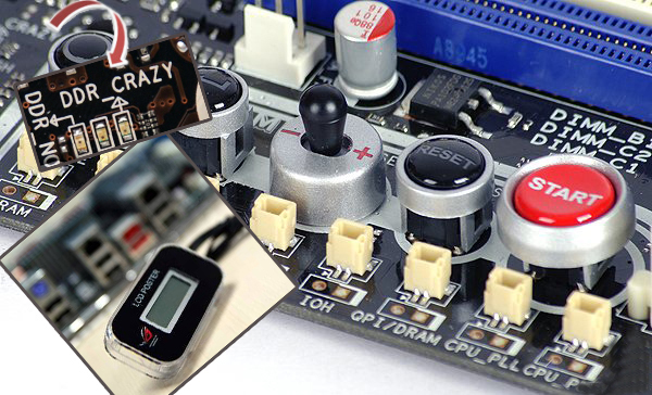 Rampage一贯的TweakIT技术也没有缺少,通过这种控制杆似的的控制使所有的超频选项都可以调节,我们可以在不进入BIOS的情况下对主板进行超频,也可进行主板最佳性能优化。而在TweakIT前面的就是ProbeIt,能通过连接附带的LCD Poster前置式De-Bug灯(虽然Rampage II Extreme提供的这个LCD Monitor不像P6T Deluxe OC Palm Edition 中的 OC Palm那么豪华)可以在玩游戏的同时进行超频。另外在TweakIT旁的PCB板上我们可以清晰的看到,DDR Normal、DDR High、DDR CRAZY...动态监视信号LED,相信没什么比电流直接通过,启动LED观看到更准确吧……