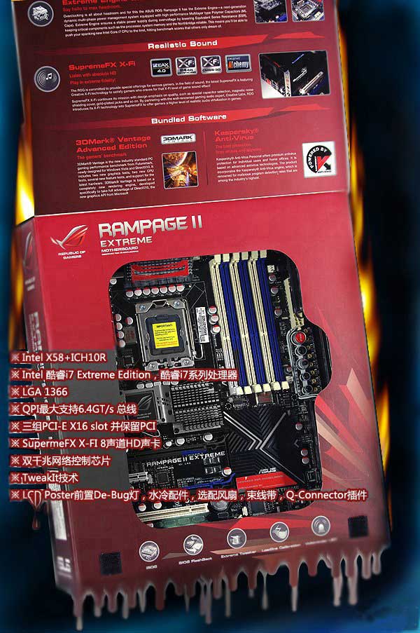 Nehalem来临之际,基于目前Intel旗舰X58芯片组的主板无疑成为关注的焦点。华硕在P6T Deluxe主板刚曝光后不久,又一款更令人兴奋的X58产品也悄然来到我们PCHOME评测室,那就是玩家们所熟悉的,华硕旗下专为超频玩家设计的Republic of Gamers(玩家国度)系列产品——Rampage II Extreme。“玩家国度,玩得不仅是硬件……”,当第一眼看到外包装的时候,就已感到它“血腥味”十足,气势逼人,绝对是超频极客爱不释手的一款玩具。