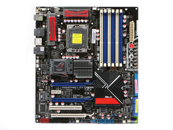 正如所看到的,眼前的主板正是Rampage II Extreme。黑色的基调色调,主板上各种银色、灰色、蓝色和血红色错落的搭配。由于处理器架构不同,所以相比以往标准的ATX主板而言,新的X58芯片组主板又会有怎样的变化呢?