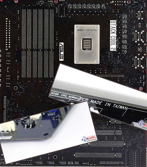 Rampage II Extreme采用了8层的PCB,产于祖国宝岛台湾。从背部的情况看到,由于Rampage II Extreme3组PCI-E都支持x16模式,所以并不会看到PCI-E部分有任何空焊的情况。另外Stack Cool 2的经典特制大面积敷铜PCB来辅助关键电路的散热设计也必不可少。散热设计处理的好与坏是与超频潜力直接挂上钩的,那下面就让我们来看一下这次Rampage II Extreme的散热设计。