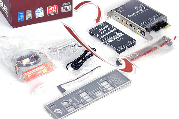 图中附件包括:Mosfet主动散热器、LCD Monitor、X-Fi声卡、三路SLI桥联器(可惜不是软质的)及Corssfire桥联器、加入了发光膜设计的I/O挡板。