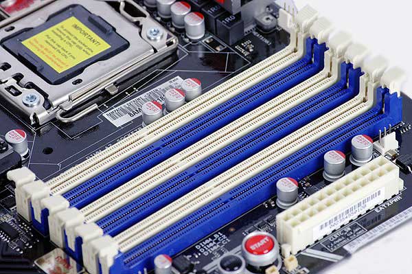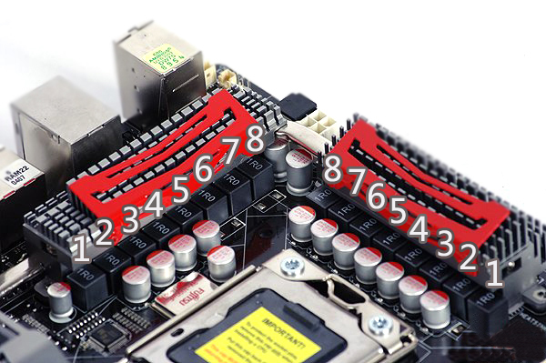 Rampage II Extreme支持DDR3 1800(OC)/1600/1333/1066/800MHz, 并支持ECC内存(事实上2000MHz规格下也能安然驶入),主板在设置6条内存插槽的情况下,还是在插槽之间预留了一些空隙,方便玩家安装一些覆盖厚重散热片的内存产品。
