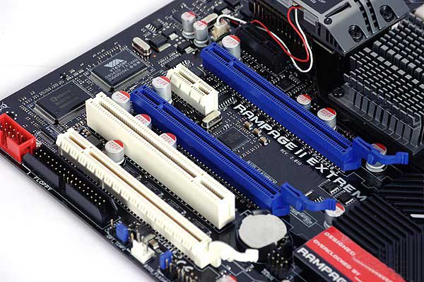 扩展部分包括二条PCI x1插槽为了创新SupremeFX X-Fi独立音频声卡所配备。三条PCI-E 2.0插槽可以实现双x16的交火或者x16/x8/x8模式,并且会首次提供对NVIDIA的SLI的支持。在PCI-E插槽中间华硕还见缝插针提供了一条PCI插槽,方便其它设备的连接。