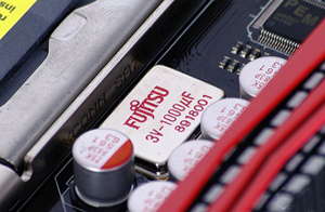 其次,在形似“血盆大口”的两处MOS散热器勾画下蕴藏着的是16颗“智齿”。Rampage II Extreme所提供的16项供电则为传统的Vcore提供电力,并在处理器及内存旁“镶嵌”了两颗FUJITSU的3V-1000uF的金属电容。按照华硕的介绍,这样的设计能方便实现较低的耗电和温度。除了扎实的供电,Rampage II Extreme使用了寿命为富士通 ME 系列 2.5 倍以上的富士通 RE 系列电容,能更好地保证重负荷或者超频状态下的稳定性和可靠性。