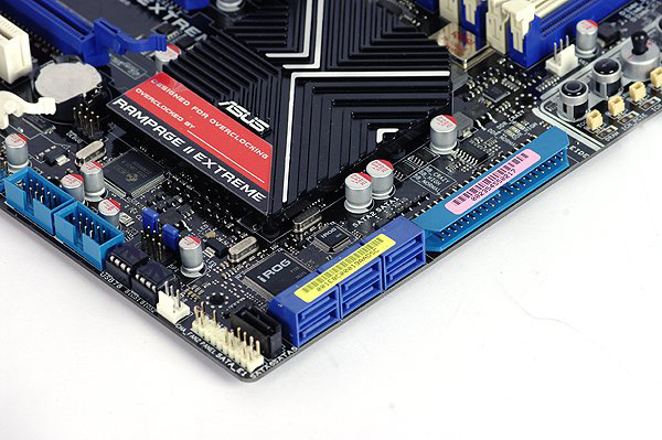 Intel ICH10R的高级南桥,与当前通行的做法一样Rampage II Extreme也采用了JMicron的JMB363芯片追加了一个IDE接口,并且额外获得了1个SATA接口,一个eSATA接口。Rampage II Extreme在SATA/IDE部分都已改成90度的设计了,不会存在对使用长身显卡造成的干扰问题。
