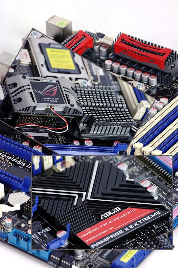 稍稍让我遗憾的是Rampage II Extreme并没采用水冷头的散热方案,而是沿用了近几款玩家国度产品中常见的模块化散热矩阵,在MOS管、北桥、南桥芯片上安装了高密度散热片,并用热管相连,组成一个高效热管散热模块。不过值得称赞的是北桥及MOS管部分的散热片是可以拆卸的,想必一定能满足那些“动手能力超强”的Diyer,更何况主板拥有多达七个风扇供电接口,分布在主板的各处方便玩家连接各种散热风扇。