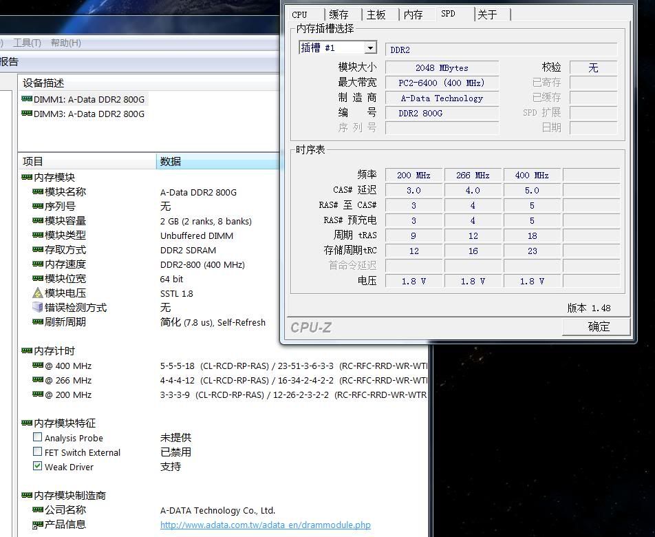 买的时候有2种,一种是HY芯片,CPU-Z能识别并显示内存序列号,另外一种就是现在看到的,威刚的芯片,“序列号”那一栏只显示“DDR2 800G”,why?