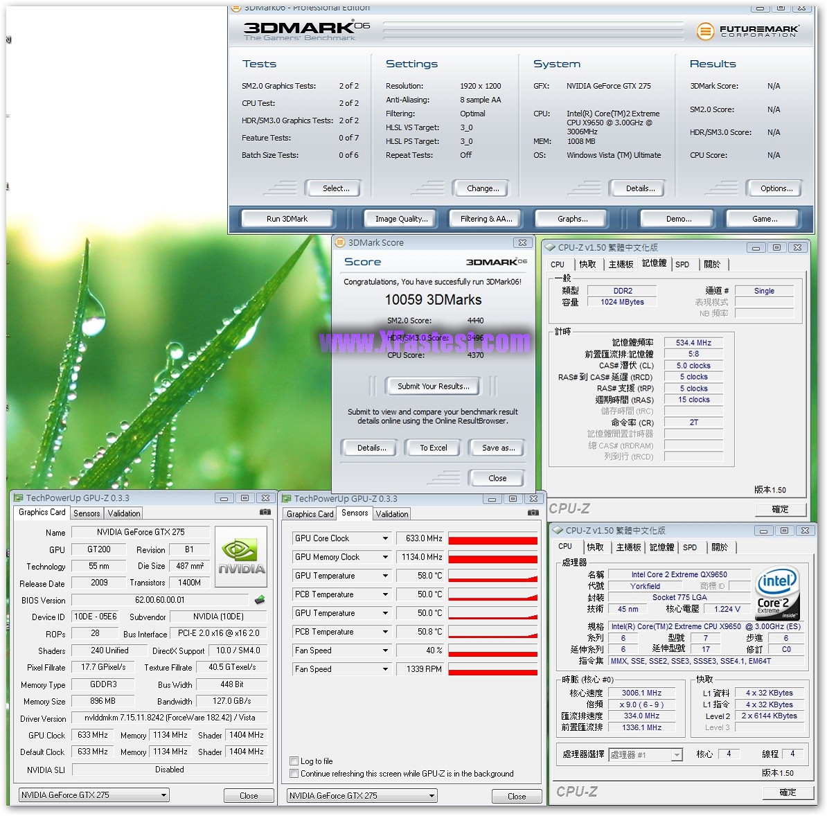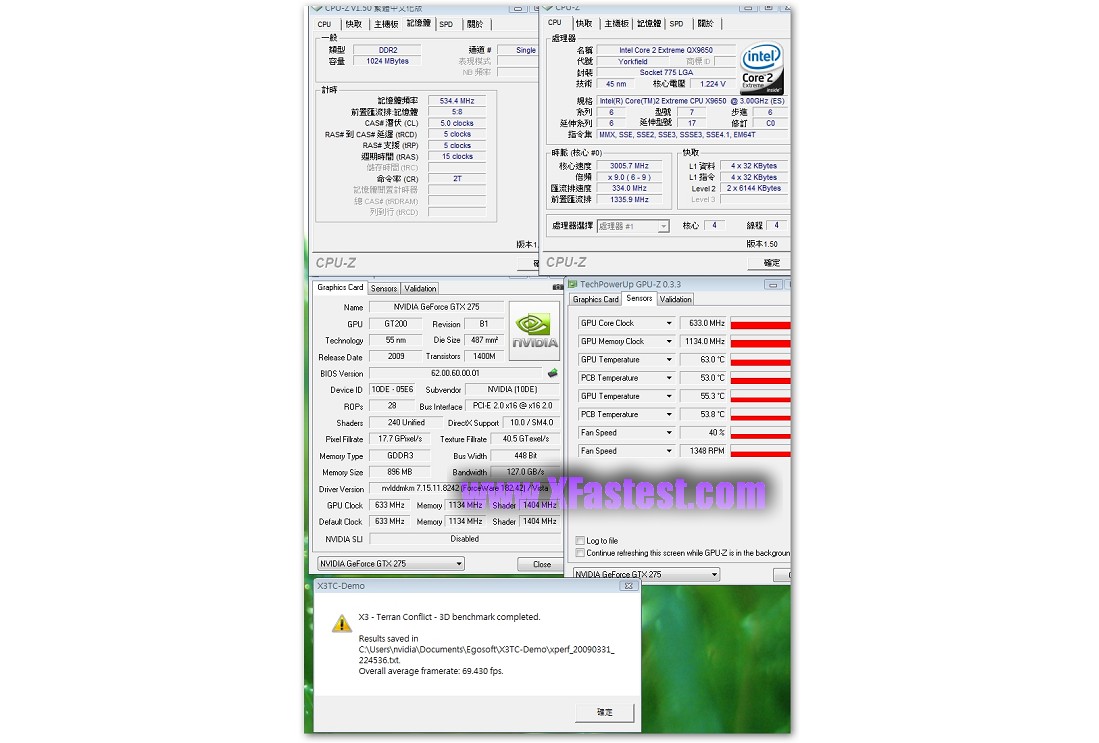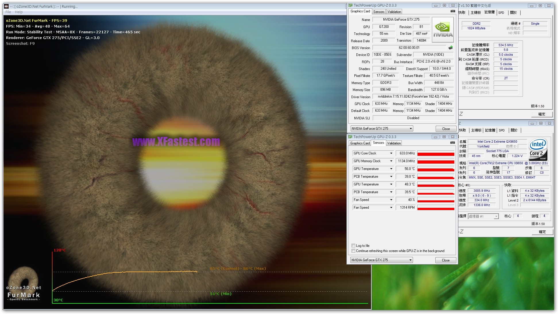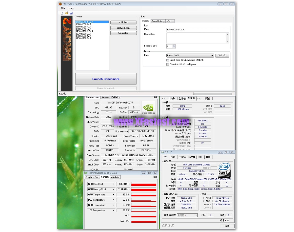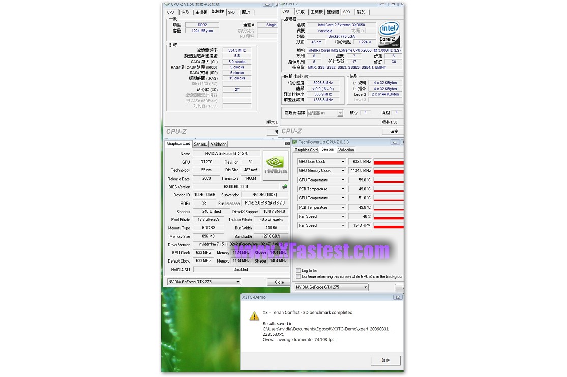 來一張GPU-Z吧,GPU-Z 0.3.3版已經可以正確辨識出GTX275,GPU的核心時脈633Mhz,記憶體時脈1134Mhz,Shader跑1404Mhz,記憶體容量有896MB,雖然沒拆下來看,但根據之前得到的資料顯示是Hyrix的GDD3顆粒。平台QX9650,Maximus II Formula,DDR2跑1066Mhz而已,其他維持Default。