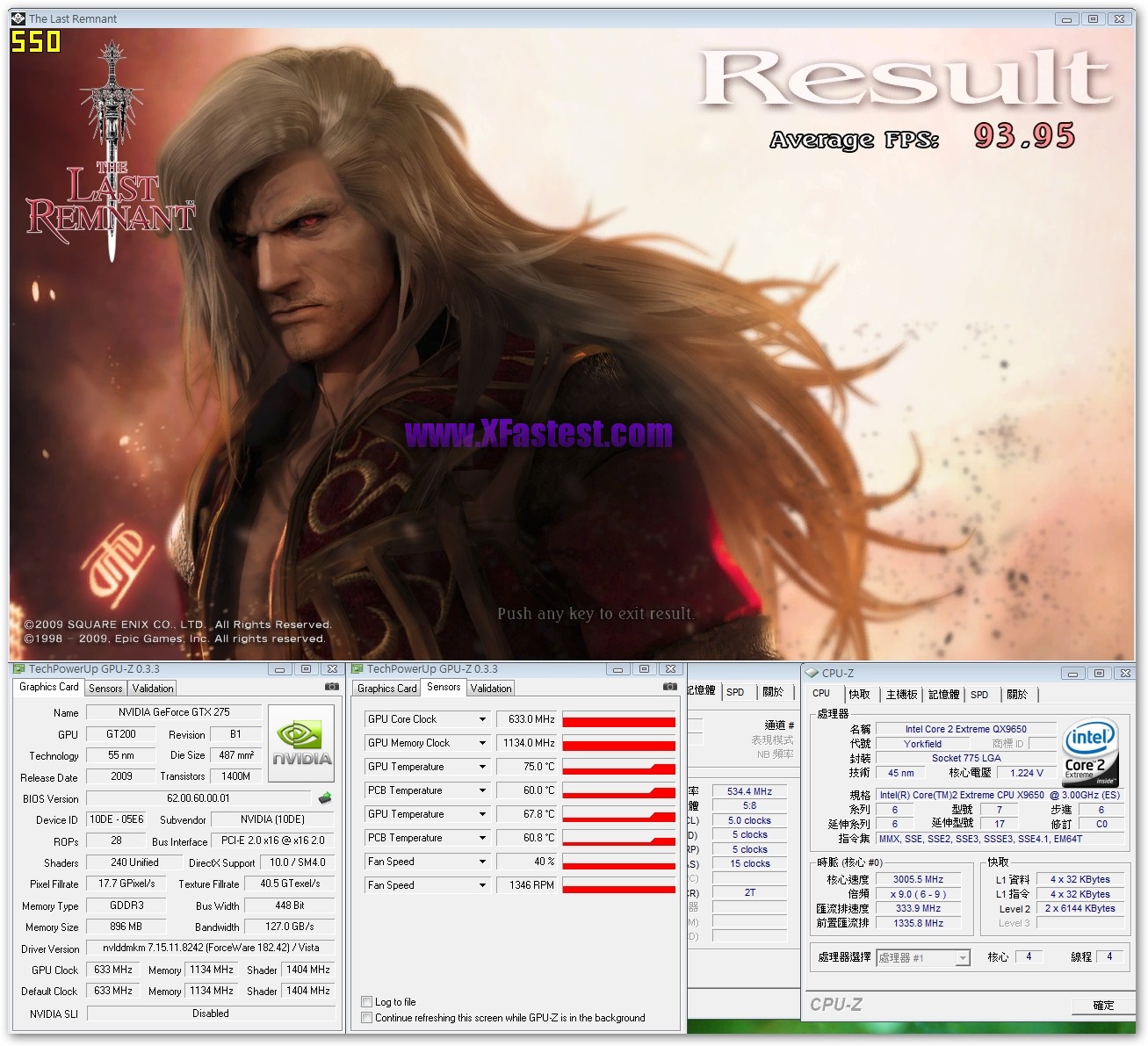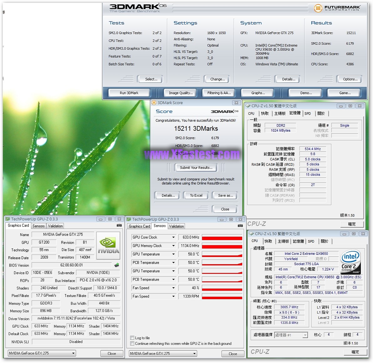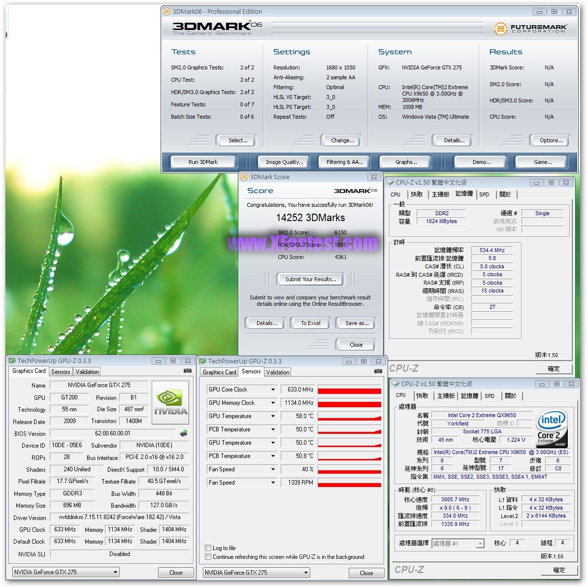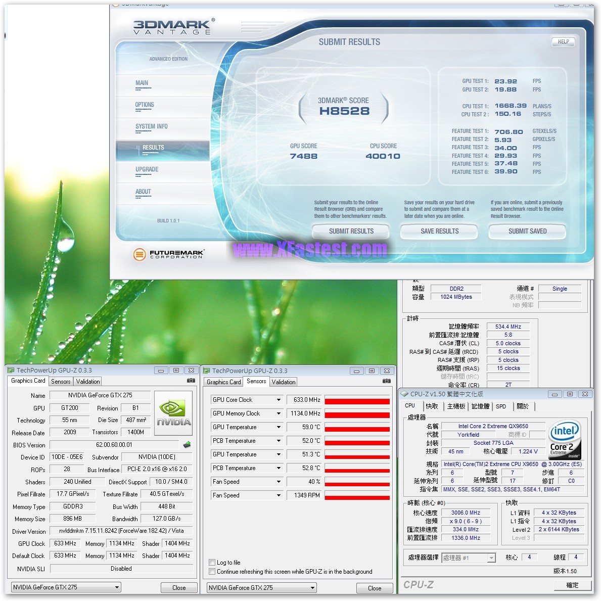 來一張GPU-Z吧,GPU-Z 0.3.3版已經可以正確辨識出GTX275,GPU的核心時脈633Mhz,記憶體時脈1134Mhz,Shader跑1404Mhz,記憶體容量有896MB,雖然沒拆下來看,但根據之前得到的資料顯示是Hyrix的GDD3顆粒。平台QX9650,Maximus II Formula,DDR2跑1066Mhz而已,其他維持Default。