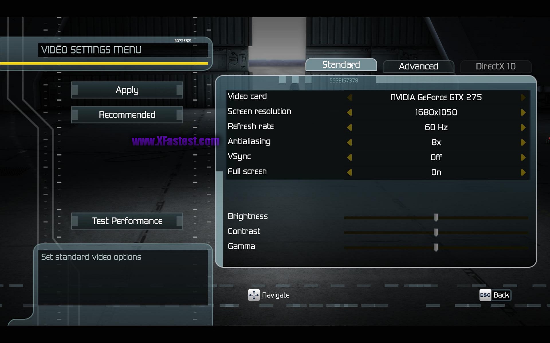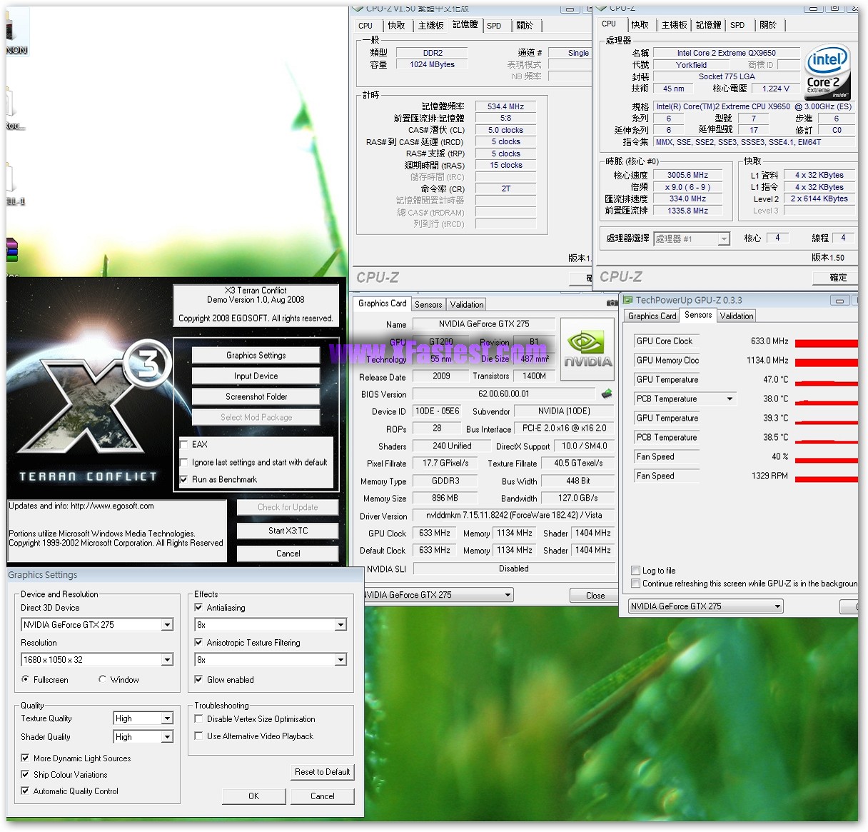 另外一個在台灣比較冷門的遊戲,X³: TERRAN CONFLICT,是由EGOSOFT出品的,同樣DEMO內帶有TimeDemo可以測試,這套遊戲是第三代了,看膩了一堆Crysis或者是惡魔五月哭第四代的話,就來看一下這個測試的表現吧,這套遊戲同樣的特效相當多,你可以想像成3DMARK VANTAGE的scene 2,大量的行星材質貼圖,而這套遊戲同樣不是NVIDIA綁標的,測試項目一樣以1680x1050以及1920x1200的8x反鋸齒執行。