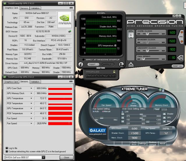 买了块花屏的YC 9800GT,温度超高,72度,退回之前就刷了bios看看,结果变GTS250。。。。。有图件正