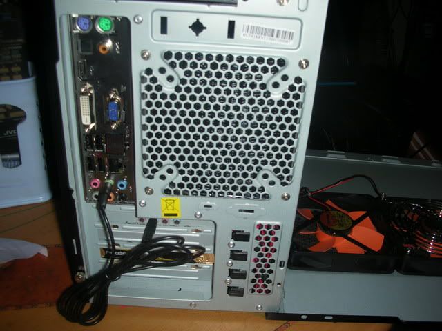 机箱後面可以看到喇叭是怎样接线的.12CM的风扇位在小机箱来说比较少有,不过我也要用力顶一下才可以把冷排装上.