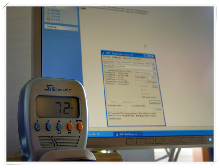 测试三:Windows XP下,通过外接硬盘对拷高清影片。此时系统通过主板上的SATA接口接有两个3.5英寸SATA 硬盘。功耗为: