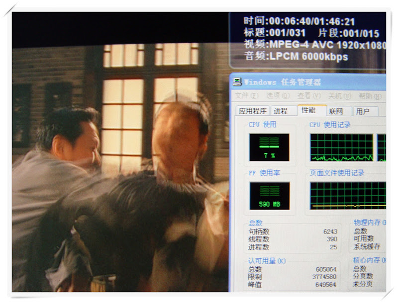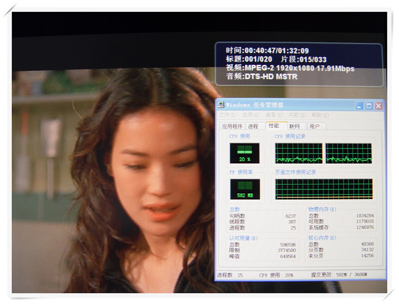 测试二:蓝光原盘《玩命快递1》,视频编码格式:MPEG-2;音频编码格式:DTS-HD MSTR;CPU占用率20%,表现一般。