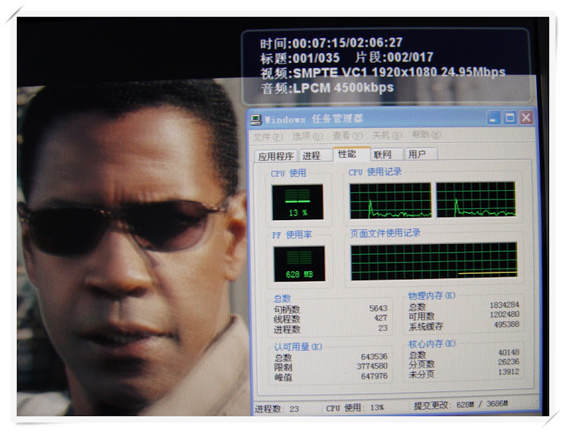 测试三:蓝光原盘《时空线索》,视频编码格式:VC1;音频编码格式:PCM 5.1;CPU占用率13%。同样的,在VC1片源的蓝光片源时,CPU占用率同样会有所波动,幅度在7%-15%左右。