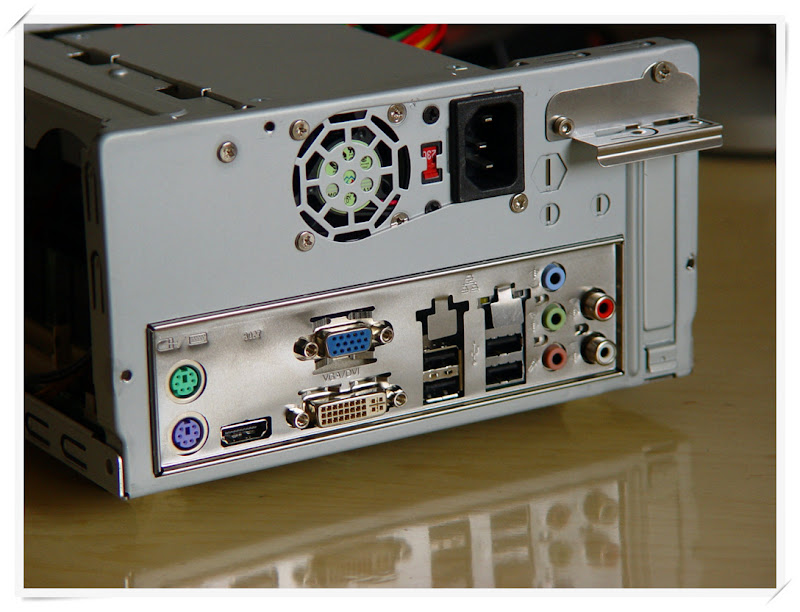 背部接口非常齐全,VGA+DVI+HDMI、四个USB 2.0、PS/2鼠标键盘接口、网络接口、5.1音频接口(带同轴输入/输出)