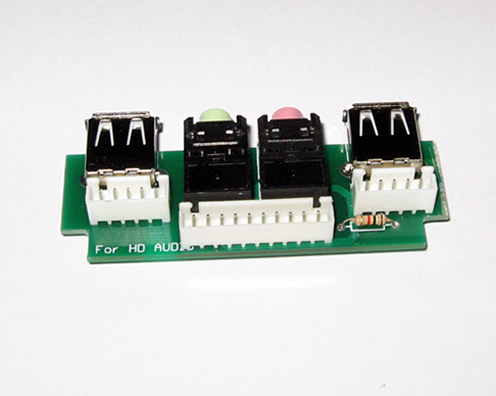 功夫不负有心人,最后在遥远的东莞[当然是在网上]找到了高度合适的插座,没想到厂家又是看不起零售业务,软磨硬泡说拿几个样品,对方答应了,但是邮资得我自己付而且是到付,我超晕,算了,还不如拿100个呢,总共花费也差不多。又是漫长的等待,买来的插座终于到了。完工以后的板子正好吻合机箱面板上的安装位置,终于折腾完了但是回头一算,为了这么一块小小的板子,偶折腾了近300块钱。