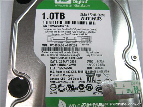 从[url=]西部数据 1TB SATAII 32M(WD10EADS-00M2B0)/绿盘[/url]标签上,除了能看到一些基本技术参数外,还可以看到生产日期、产地等信息。值得留意的是,购买时候注意WD10EADS-00M2B0这个MDL号,以免买到3碟的产品。