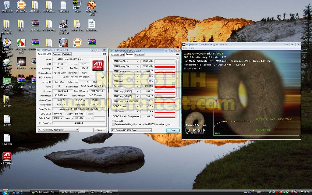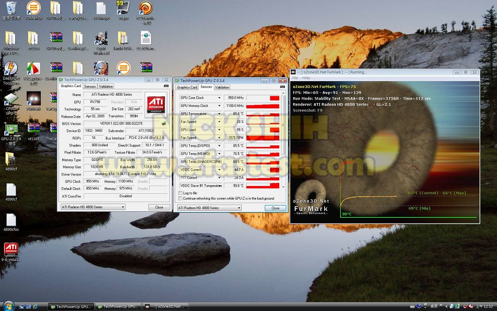 1.核心時脈 950 memory 1100 , 風扇全速3600轉