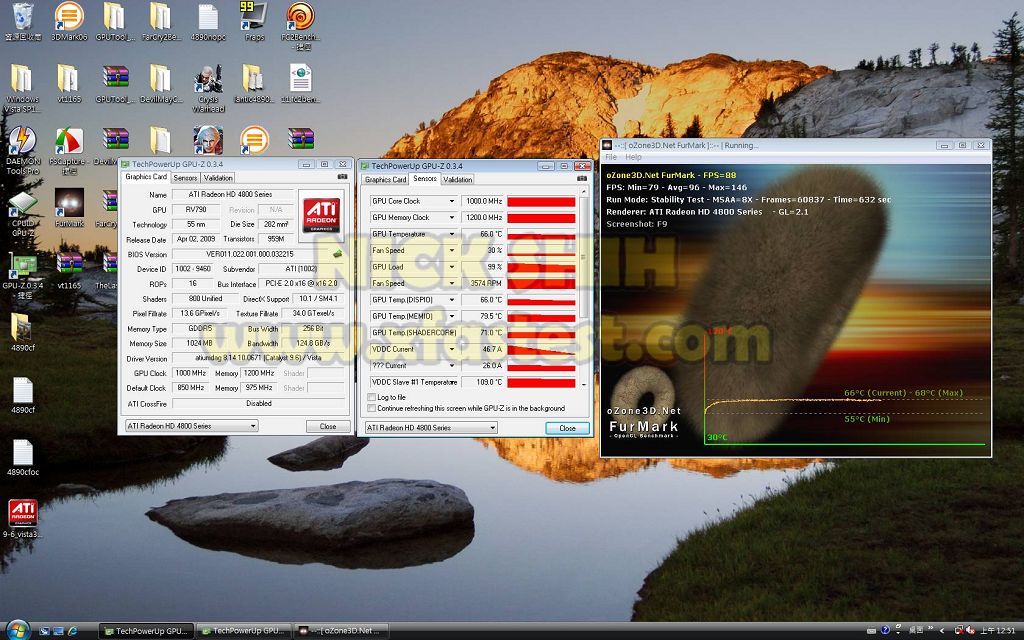 超頻至 核心 1000 記憶體 1200 , 使用風扇全速下去壓制, 燒機狀態下也有66度頂級的散熱效能表現