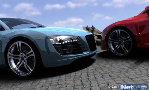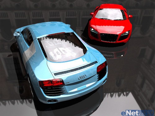 Caustic Graphics在一台MacPro上展示了一个实时渲染DEMO,其中RTRT以外的渲染工作全部由CPU负责,GPU完全不参与。DEMO中在威尼斯广场上放置两辆奥迪R8s,均由大约180万个三角形组成,周围环境只是陪衬,故而没有实际建模,只是平滑的纹理贴图。画面在VGA 640×480分辨率下实时渲染,每像素光线数量、每条光线的反射次数、反锯齿效果、甚至着色器代码等参数都可以实时调整。
