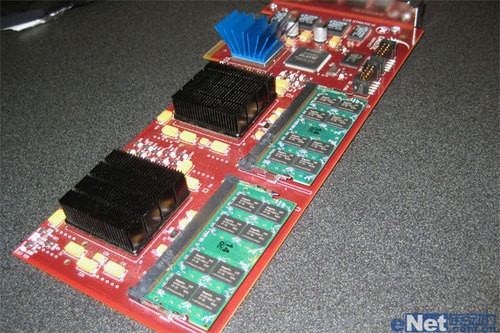 这是提供给开发人员和独立软件开发商(ISV)的第一批硬件样品“Caustic 1号”,供他们在“CausticRT”平台上测试、编程和设计之用。该卡采用PCI-E 1.0 x4接口,两块黑色散热片下边就是两颗传说中的“光线追踪处理器”(RTPU),其实都是简单的FPGA(现场可编程门阵列),运行频率100MHz,每颗RTPU都设有自己专用的64-bit DDR2 SO-DIMM内存,另外蓝色散热片之下是PCI-E桥接芯片,由于RTPU的功耗非常低,整卡采用单槽被动散热设计。