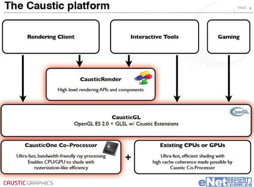 Caustic Graphics一开始并没有设计硬件产品的打算,但是当他们自己的独门实时光线追踪算法诞生之后,他们无法在目前的市场上找到符合自己算法要求的CPU或GPU。Caustic Graphics编写的算法之所以独特是因为它解决了传统光线追踪算法偏向随机性的问题,新算法大幅提升了光线追踪计算的局部性,但这部分的算法需要他们自己设计一颗协处理器来完成。Caustic Graphics的工程师们非常明智,他们对于自己硬件的定位仅仅是一颗专注于光线追踪运算的协处理器,而绝不干越俎代庖的蠢事——shader之类的传统光棚化操作依旧由GPU来完成。
