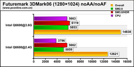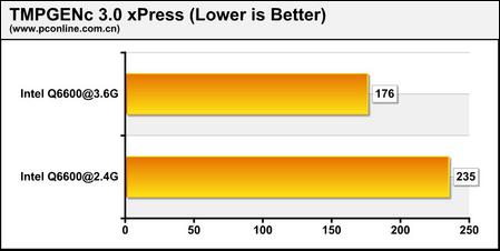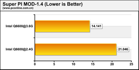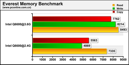 从测试成绩我们可以看出,由于超频之后的Q6600在内存带宽上有了明显的提升,因此在内存测试以及大量数据吞吐的测试中,OC之后的Q6600有了非常明显的优势,最高领先幅度甚至达到100%。