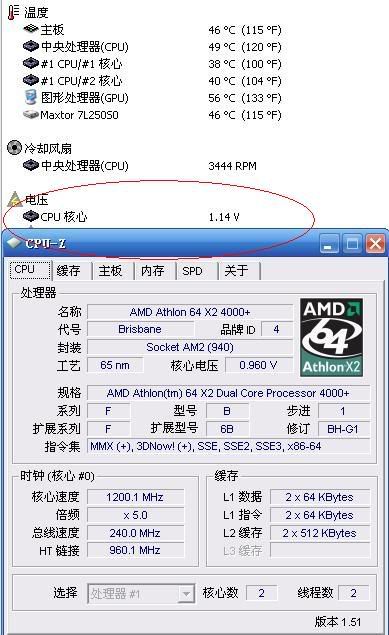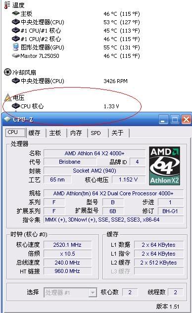 AMD双核速龙X2 4000+ 65NM(65纳米)版本,原始频率200*10.5=2.1G,二级缓存为512K*2=1M。CPU是盒装行货,不过原配的盒子和风扇都不见了,当散片出了。带风扇,风扇是拿朋友的原装AMD X2 4000+风扇,只不过不是原配那个,风量和转速还不错,声音也不大。因为没有原盒和原风扇,已不可能保修,所以不包OC。具体参数见CPU-Z图。因为CPU-Z不能正确认出我的主板的cpu电压,所以电压看Everest。CPU图是网上找的,CPU-Z图是自抓的。