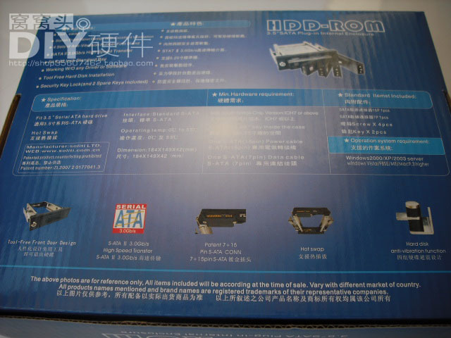 | SATA抽取式硬盘盒免外盒,使用方式和用硬盘柜放置硬盘差不多,只要把外框装在机壳的5.25"位置,然后硬盘放进去,锁上面版盖,就可以使用了,不需要装个内盒再放进外框,这样更换硬盘就又更方便了.现在市场上非常畅销,适用世界各大厂牌3.5寸SATAI、Ⅱ接口的硬盘,无容量限制,解决了传统抽取盒使用背板PCB所产生的不稳定性。适用于所有类型的机箱与磁盘阵列系统。高级材质、质感佳、耐用性强、轻巧简便、内建安全锁设计,免驱动.免内盒设计、抽拔简单,拔了就走,插上就用。符合5.25扩充槽设计,符合3.5吋SATA硬盘设计,支持热拔插,支持SATAII规格达到3.0Gb/sec,采用标准SATA接口,操作温度:0-50度C,输速率:150MB/Sec。 适用不同操作系统平台,如Windows/LINUX...等。操作系统及应用软件可安装于3.5”硬盘中当作开机碟使用。产品系列具热插拔抽取盒模块设计,可让您于不同储存设备/使用情境中(如机房V.S.办公室),自由更换与管理数据,一次满足您数据流通的需求!可将您最重要的数据储存于3.5”SATA硬盘中,并运用硬盘热插拔的特性,随时更换硬盘或进行数据管理工作。广泛应用于工控安防,及音像制品等领域,安装于服务器,工控机,个人计算机,硬盘录像机等.用于文文件,数据,数据的存盘与备份。 | ||