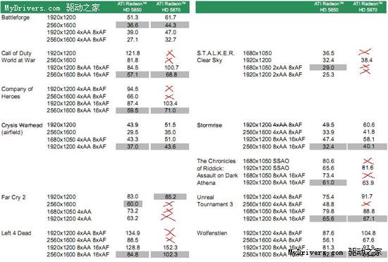 这方面此前也披露过,不过不是很全面详细,下边就看看更完整的,分辨率、AA、AF、帧率等都全部列出。当然,数据还都是AMD官方的,仅供参考。 注意:Radeon HD 5870双卡、三卡交火的对比对象是GeForce GTX 295 SLI,也就是四颗GT200b核心,此前遗漏了关键的SLI。