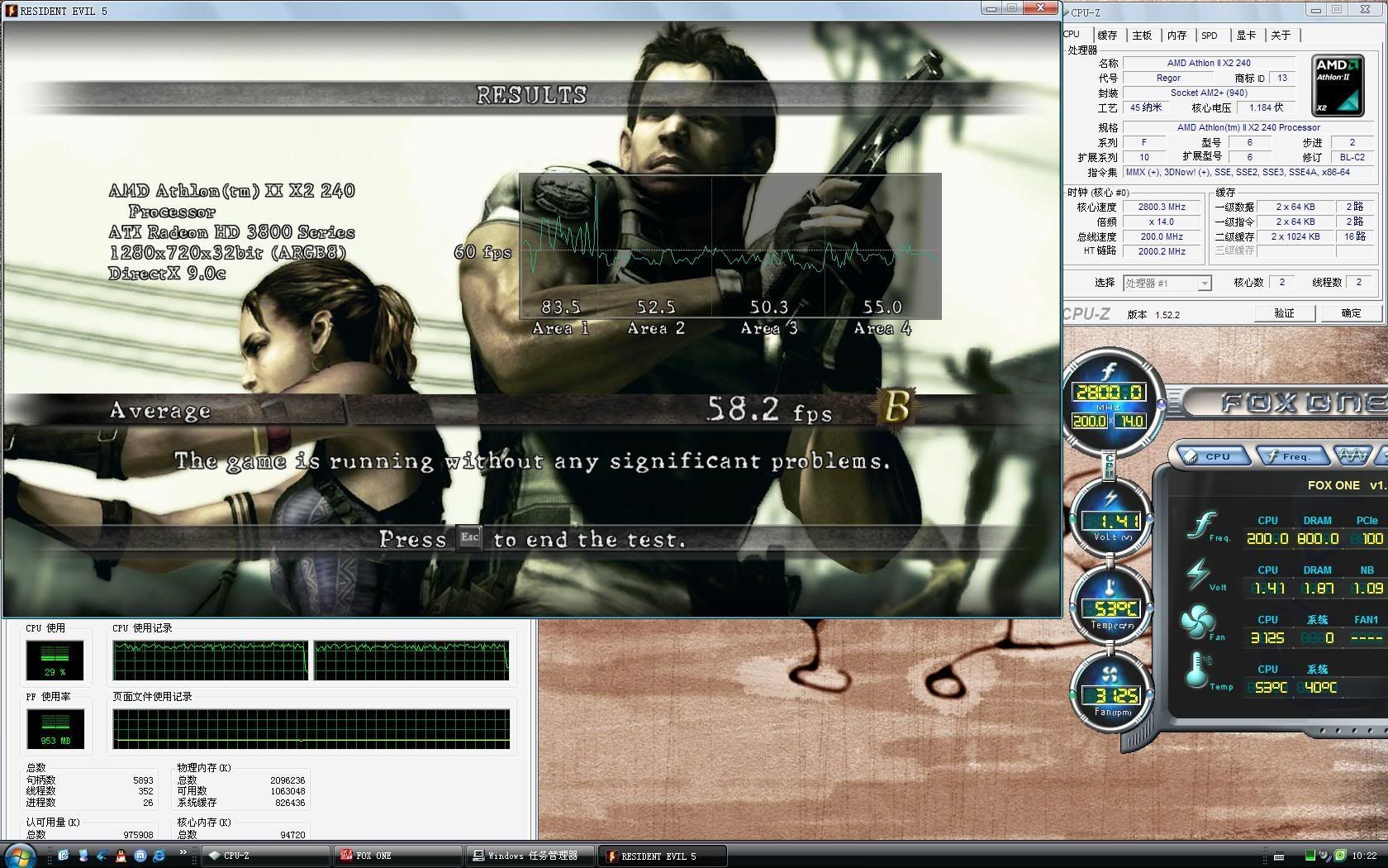 首先进行的是闲置待机5分钟然后记录得出的温度,游戏测试则采用生化危机5自带的benmark工具进行,满载测试则进行ORTHOS5分钟拷机。