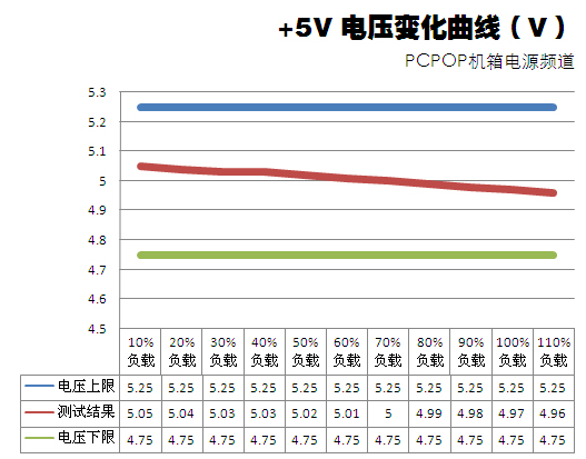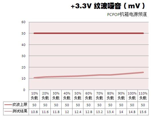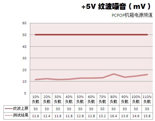 5V的输出变化略大,达到1.6%,3.3V稳定性非常好,只有0.91%。总的来说这款电源的电压稳定性比较不错,但说不上优异。