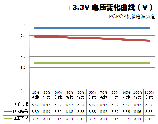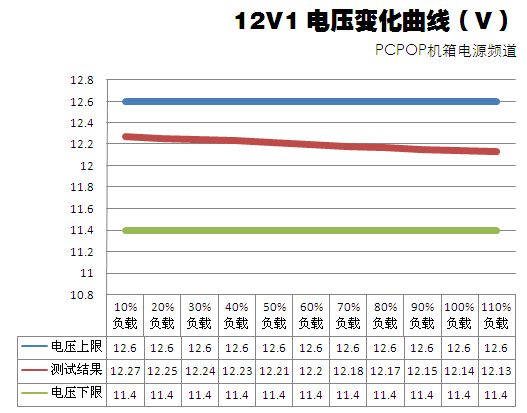 下面六个图表是电源12V,5V,3.3V在负载从10%-110%下的电压变化,完美情况应该是不论负载大小,电压都应该死死保持在12V、5V、3.3V,不过这是不可能的,一般规律是随着负载加重,电压下降。