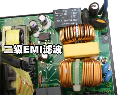电源的二级EMI滤波由一差模电感,一个共模电感,一个X电容,一对儿Y电容,一个浪涌吸收器(黑色热缩管包裹),一个保险管(黑色热缩管包裹)和一个继电器组成。继电器的应用可以防止浪涌保护器的失效。(电源运行一段时间后关闭,再马上开启时浪涌保护器的温度来不及恢复)