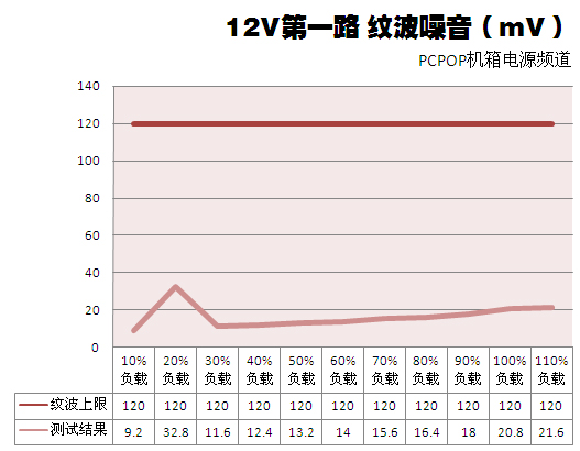 先说总体,12V纹波抑制非常出色!连规范的三分之一都没达到。任何溢美之词来形容它都不为过。不过我们还是需要关注20%的负载点,这一点上纹波突然增大到33mV,而且从波形上看也和其他负载点上的纹波有很大区别,难道是PWM方式在这个功率附近会切换到FM方式么?