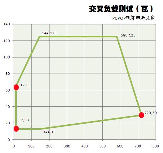 图中每个点代表一种功率分配方式,前面的数字是12V的输出功率,后面的数字是3.3V和5V的联合输出功率。这款电源的功率虽然仍在EPS标准内,但因为电源标签上标注的3.3V和5V的联合最大输出为125W,而EPS中这个瓦数的电源应该为170W,所以我们把EPS中交叉负载的一些参数做了适当调整:175W改为125W。虽然减小了,但实际应用中,以12V称霸天下的硬件功耗中,125W分给3.3V和5V是完全足够的。