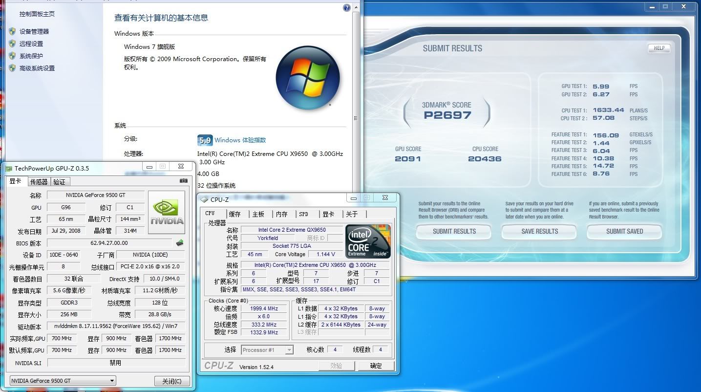 悲剧的7菜红P45,悲剧的QX9650,悲剧的9500GT,悲剧的3DV分数...