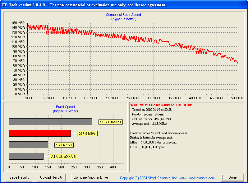 好像突发很高,195,下面几位的突发大多140多,这是我的WD5000AAKS,做为系统盘测的,没开AAM