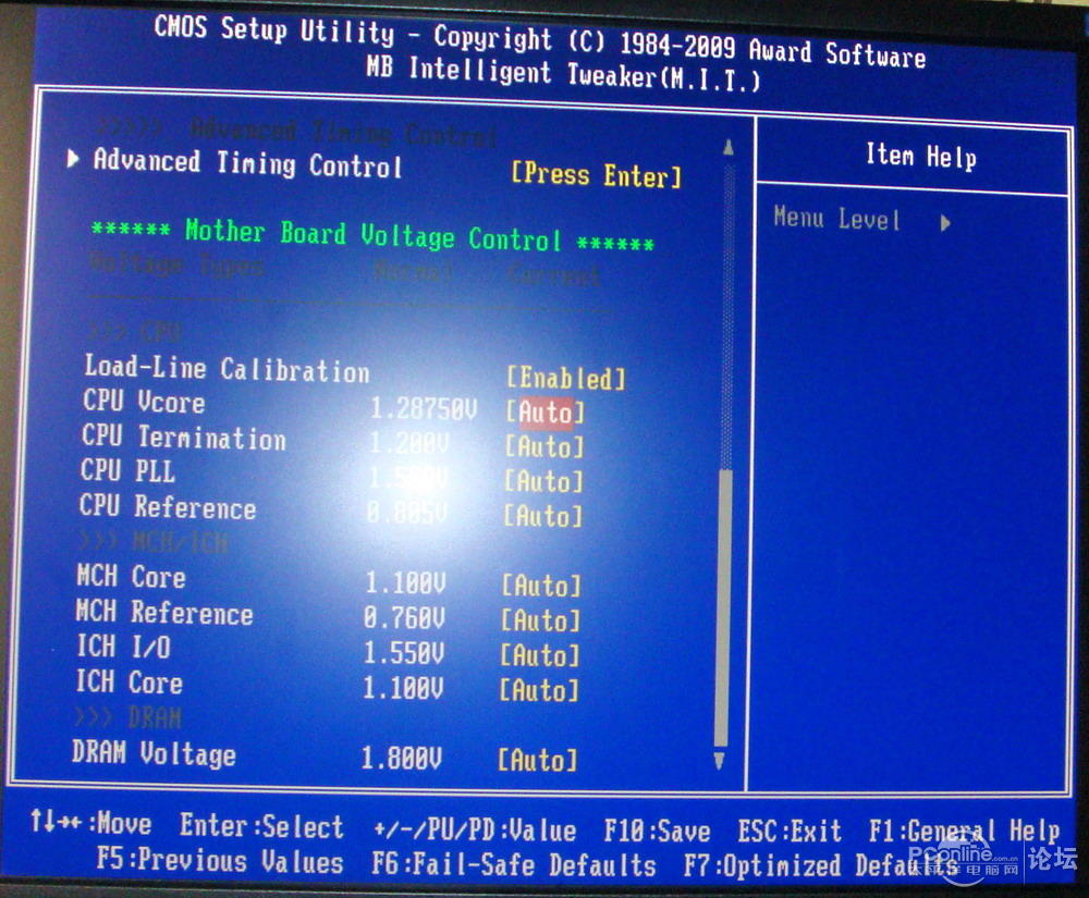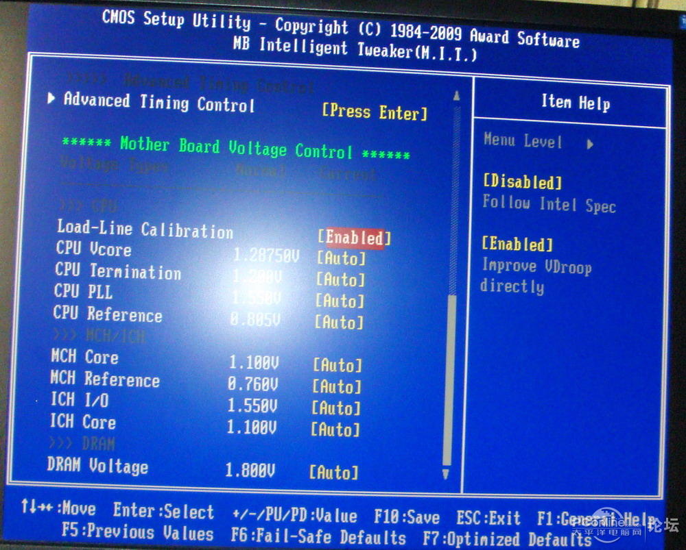 七、CPU电压设置。Q8200官方安全电压是1.25V,此U默认电压如图可见为1.2875V,超频若电压设为自动(AUTO)的话,会出现烧U的可能,保守起见还是设为1.25V为妙,见图
