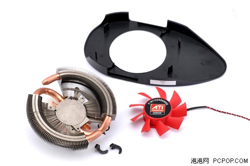 在此,我们先回顾下旧版全封闭式散热器的结构,旧版的散热方案就是利用涡轮散热风扇通过塑料外壳的风道经过散热片把热量排出[url=]机箱[/url]外部,这种散热方案也是我们近几年常见的公版散热方案。而这种散热方案不足的地方是,核心热量容易积聚在散热器的散热片内,散热效率相对较低,而且供电及显存等周边部分散热不能充分照顾。