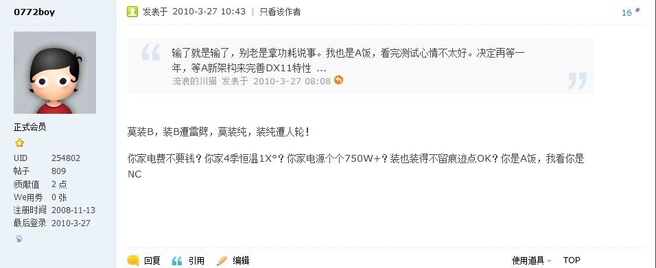 回复 henghahengha 我是不是A饭自己不清楚?除了nF2 IGP外没买过N的显示核心。大部分测试是没上5 ... 流浪的川猫 发表于 2010-3-30 15:49