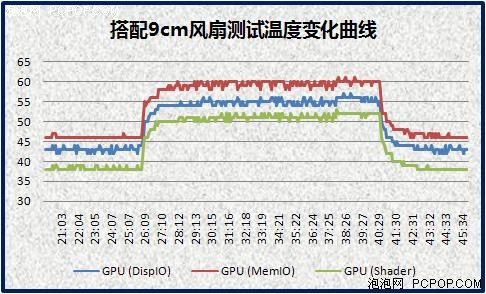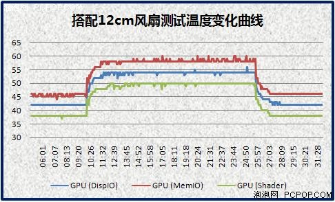 GPU-Z记录的显卡不同状态下的核心温度稳定值,无论待机还是满载,12cm风扇都发挥了它尺寸上的优势,显卡温度有了很明显的下降。同时,12厘米风扇所带来的大风量也使显卡周边的原件更加凉快。