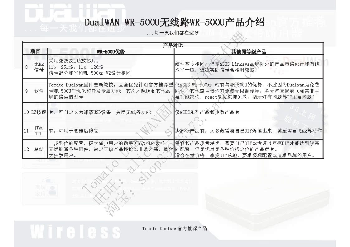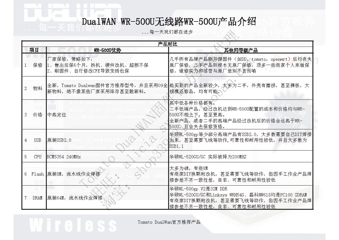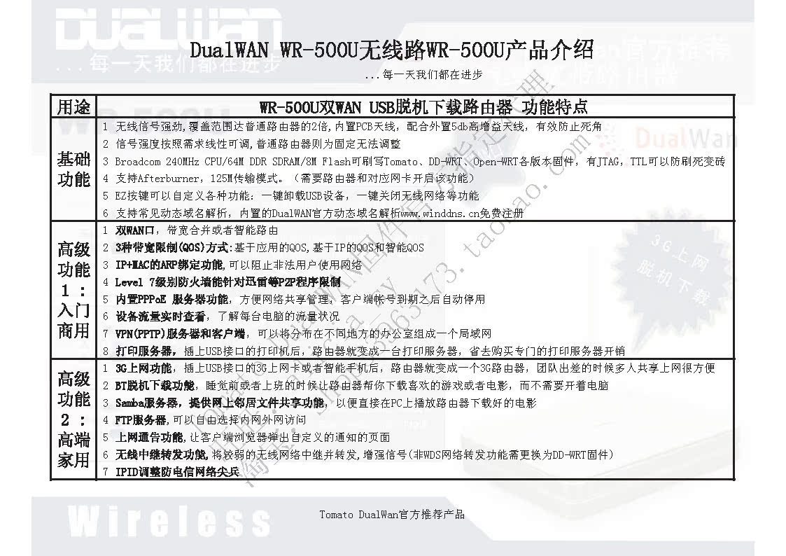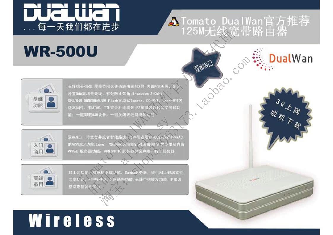 本品为Tomato DualWAN固件官方推荐路由器,型号为WR-500U,硬件与华硕WL-500gpV2完全一样,但是内存更大(64M),可刷Tomato DualWAN(支持双有线WAN)、普通Tomato固件、华硕WL-500gpV2固件、DD-WRT等主流路由器固件。超高性价比,一个月热卖近200件,累计销售近400件