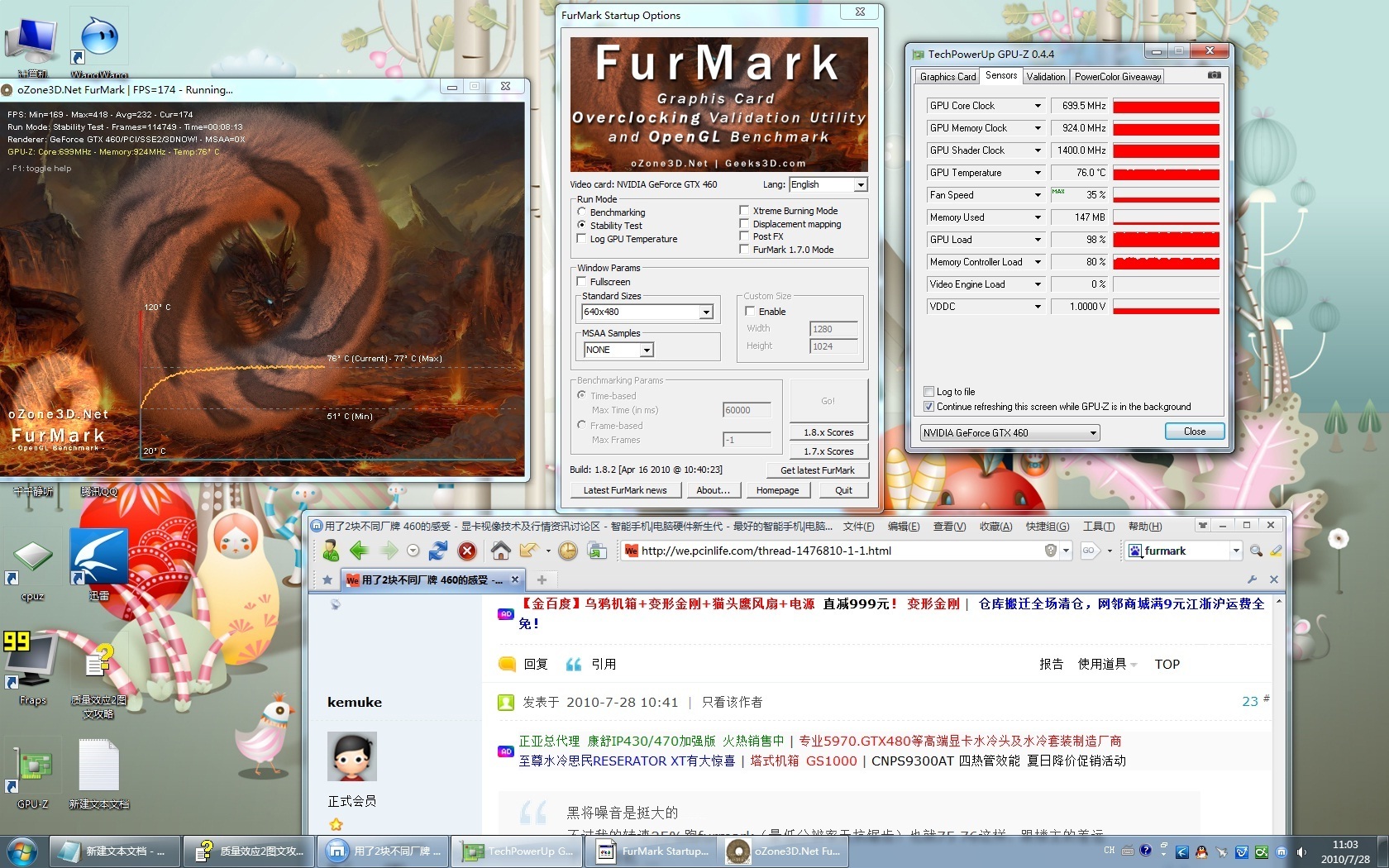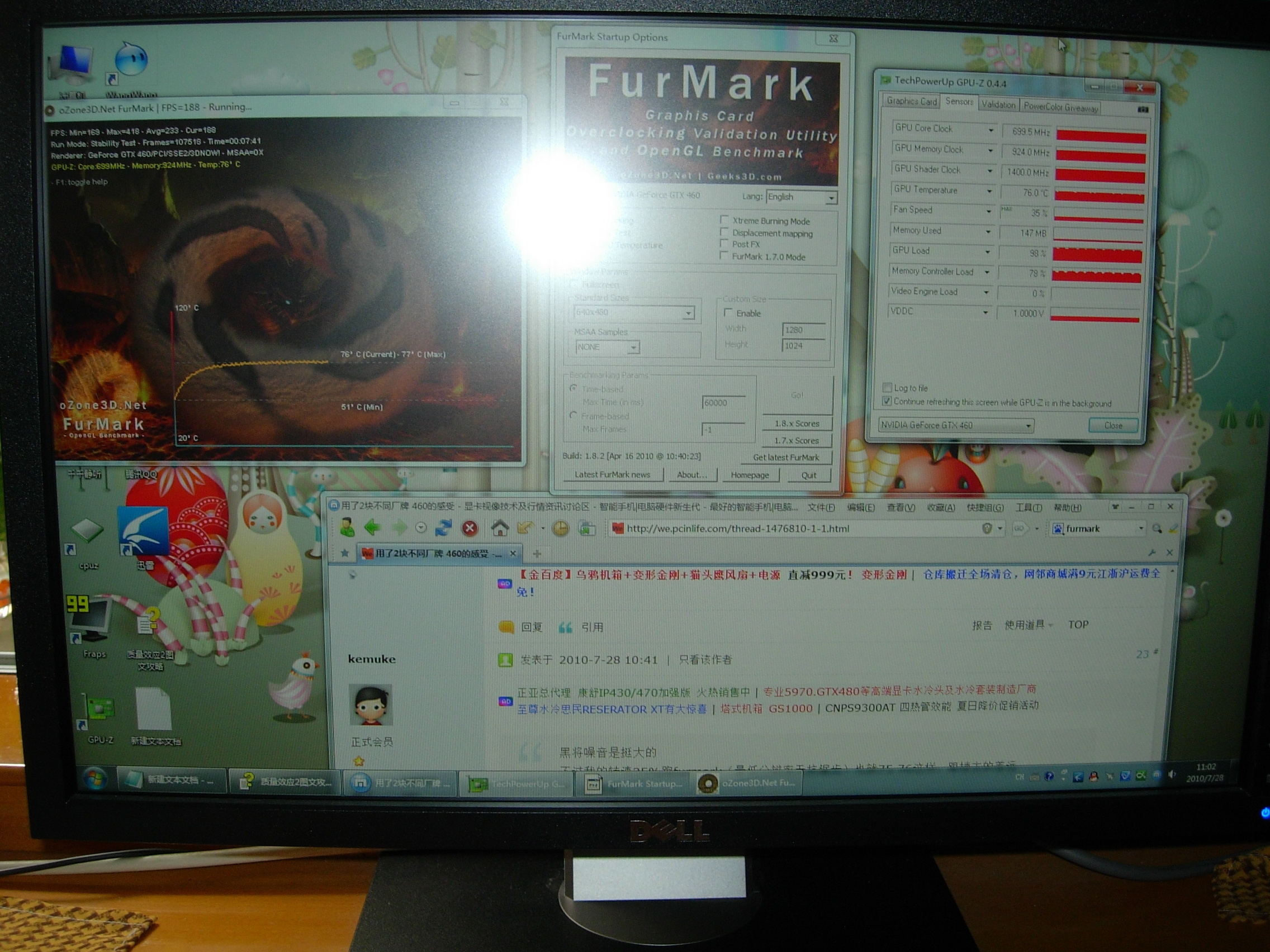 对了我furmark测试选benchmarking,分辨率1024x768。测的。刚才试过跟你一样选640x480,stability test最高 ... 排骨饭 发表于 2010-7-28 15:20