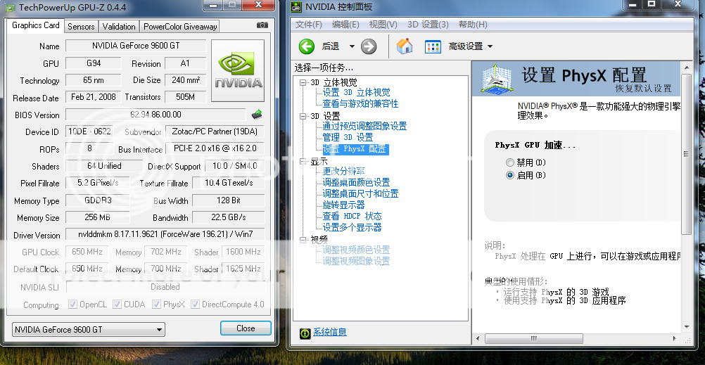 好吧,那么标准版的8600GT也取消了Physx支持吗?另一台纯净安装win7的电脑,只装了258.96WHQL驱动,也同样不能打开physx