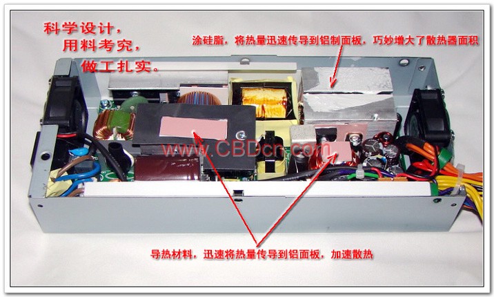2、巧妙设计,该电源上盖为铝制材料,电源内高发热元件与上盖良好导热,加上优质的风扇,能及时将热量排出机箱。