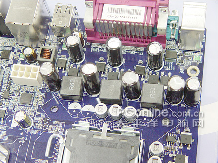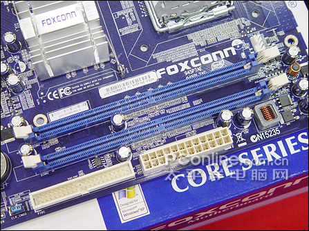 供电方面,富士康945P7AE主板采用了四相回路设计,在同类产品中并不多见,每相都采用了日系KZG直立式电解电容搭配全封闭式防磁电感线圈和四个MOS管电感,不仅可以保证为CPU提供稳定而纯净的电流,也有效的提升了这款主板的超频素质。