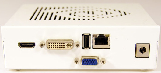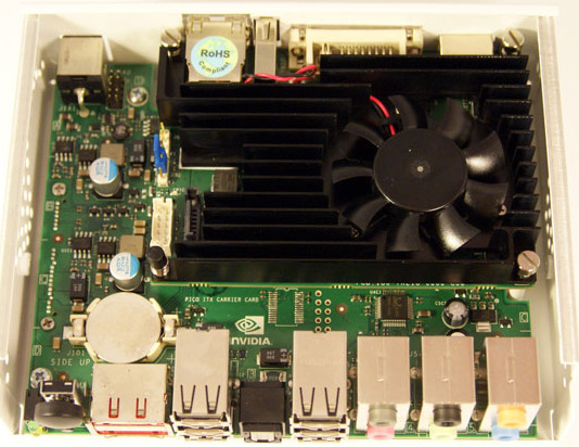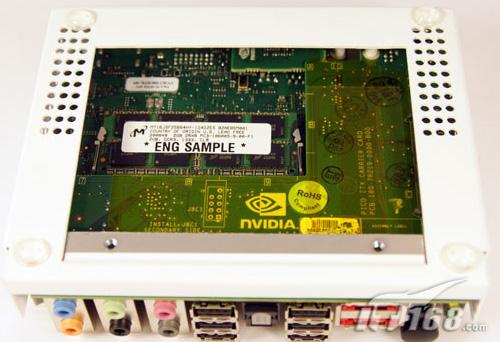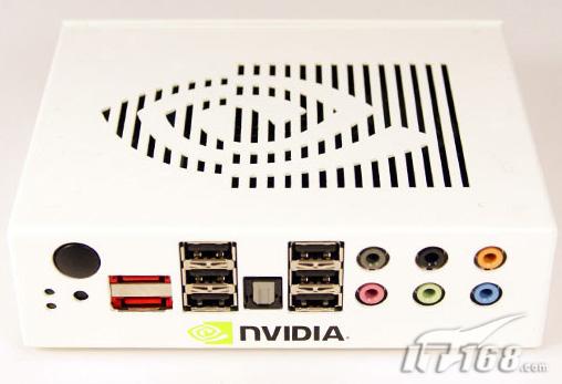 从外观来看,这款原型产品采用了白色的外观设计。很容量让我们想到苹果公司的Mac mini。产品尺寸为5.6x4.3x1.5英寸,重量只有1.4磅,感觉与早期的nettop产品十分相似。在顶部位置可以看到散热口,散热口使用了Nvidia公司的商标形状。同时在侧面还有一个辅助散热口。